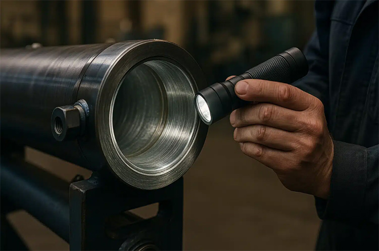 Ставете чист прст во цилиндерот и допрете го внатрешниот wallид за да проверите: Секоја гребење подлабока од 0,5 мм (околу дебелината на ноктот) ќе предизвика постојани проблеми со загадување на течности. Во исто време, набудувајте дали внатрешниот wallид на цилиндерот има униформни линии за мелење. Ако има светли точки или жлебови, тоа може да биде знак на оштетување на клипот. Пред да нарачате делови за замена, прво мора да го совладате методот на точно мерење на хидрауличниот цилиндер.